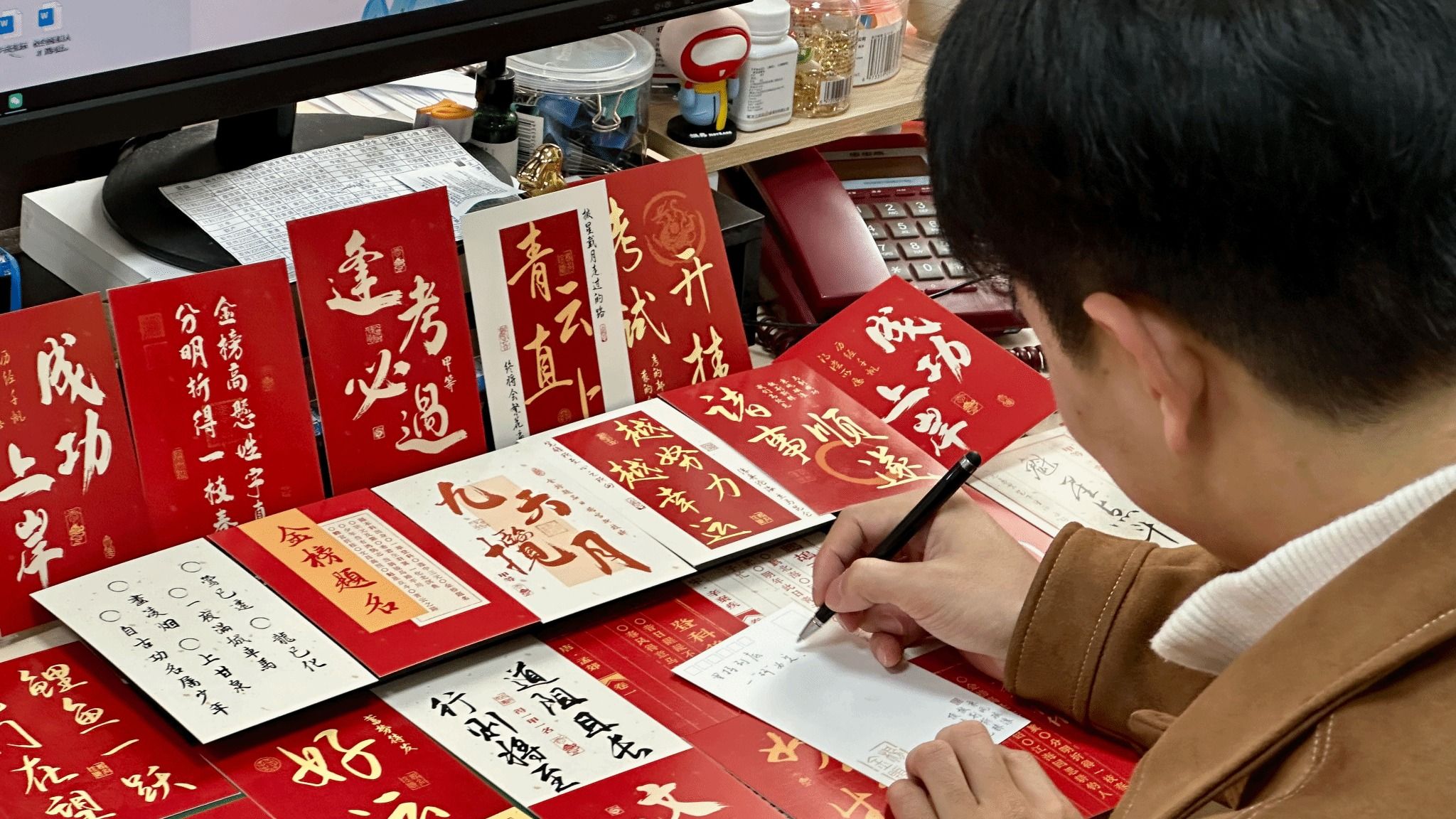 活动现场,志愿者分工协作,细致完成拆封、摆放、整理、封装等环节。成人在线精心筹备的慰问品兼具实用性与心意:文具袋内含考试必备的中性笔、橡皮等用品;薯愿薯片寓意“薯你心愿”;有传递着乐观向上精神的“加油鸭”玩偶;印刻着“考研上岸,一战成硕”的专属定制可乐;更有成人在线领导、老师与低年级学子共同手写的加油贺卡,承载着师生间的牵挂与期许。与此同时,曾宪森老师与志愿者们同步前往考研自习室,悬挂“逐梦前行,全力以赴”等励志标语,精心打造“上岸墙”——39所985高校及武汉地区知名高校的校徽醒目陈列,让自习室成为充满希望与力量的备考“能量场”,助力学子们在冲刺阶段凝心聚力。