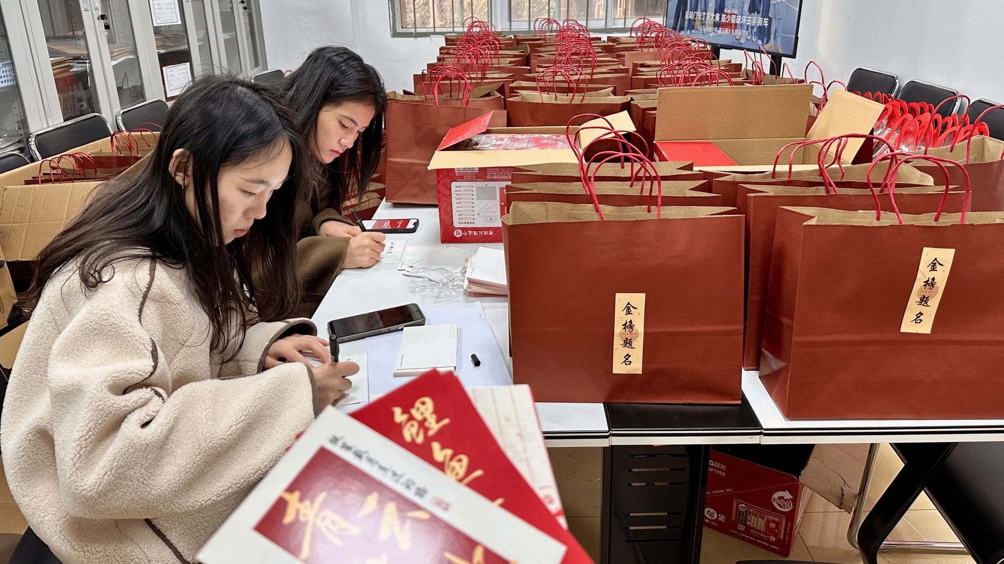 “手写贺卡上的寄语特别打动人,我们打包时也满怀期待,希望这些礼物能为他们驱散冬日寒意、注入奋进力量。”学生党员志愿者代表贾庆陈说道。考研学子孙昊羽在参观完自习室“上岸墙”后深受触动:“看到心仪院校的名字贴在墙上,还有成人在线准备的加油包,瞬间觉得备考的疲惫都消散了。接下来一定会带着这份鼓励,冲刺到底、一战成硕!”