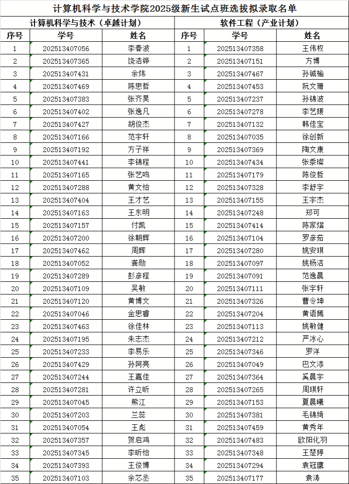 根据《成人在线 2025级新生试点班选拔考核工作安排》,成人在线于9月22日组织了新生试点班选拔的考试。根据学生考试成绩和学生志愿,择优拟录取35名《计算机科学与技术(卓越计划)》学生,35名《软件工程(产业计划)》学生。无特殊原因,拟录取学生不得主动申请退出!现将拟录取名单公示如下: