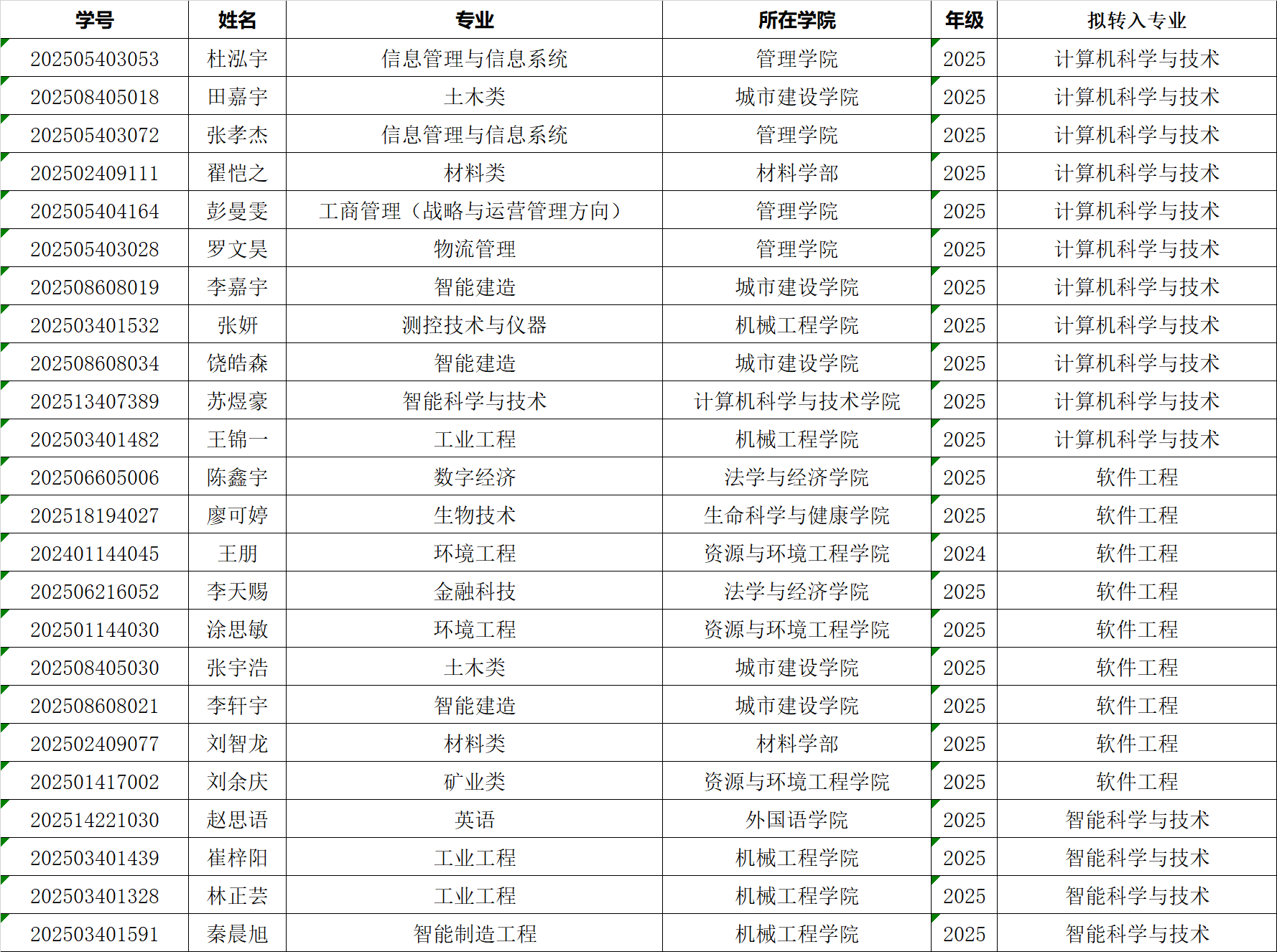 2025-2026学年普通本科生第一学期转专业考核方案》的有关要求,计算机成人在线于2025年12月26日组织了转专业PAT考试,2025年12月29日组织了转专业综合面试,对学生的专业基础知识、基本能力和专业思想情况等进行了考核。成人在线综合PAT考试成绩和综合面试情况,择优拟录取24人,现将拟录取名单公示如下。