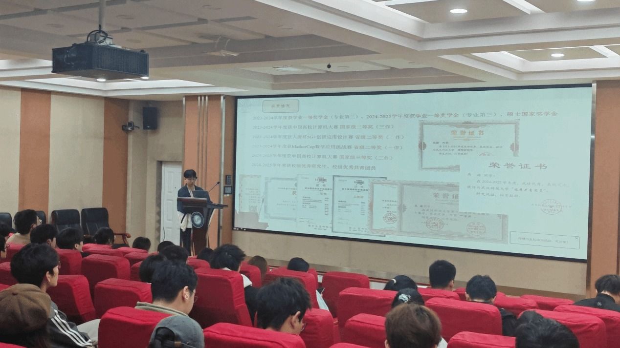 于教三楼30404报告厅举办研究生国家奖学金获得者经验分享会。2023级硕士研究生禹海、齐丹丹、徐钦及2024级研究生崔书闻作为主讲人,分享了他们在学术科研、学科竞赛、志愿服务与生涯规划等方面的成长历程与实践心得。